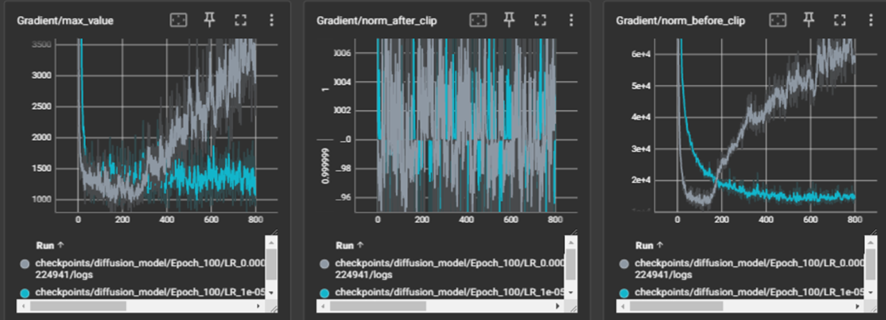 Using memory-efficient U-Net we proposed, we were able to not only save RAM usage, but also improve performance. This memory-efficient U-Net converged faster, where U-Net without this method often diverged. The figure below shows that proposed method suppresses the size of gradient, preventing gradient explosion.